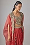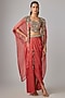 Featuring a deep orange blouse in silk base with thread work. It is paired with a modal satin skirt and an organza cape. Accentuate it with stud earrings and heels for festive wear, sangeet or wedding ceremonies.