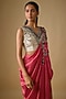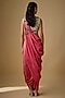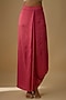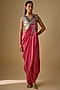 Featuring a deep peach skirt in silk base. It is paired with a blouse and a drape having thread work. Accentuate it with kundan polki jewellery and heels for a festive occasion or sangeet ceremony.