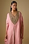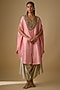 Featuring a deep peach kaftan in silk base with multi thread work. It is paired with cotton satin pants. Accentuate it with kundan polki earrings and heels for festive occasions or pooja ceremony.