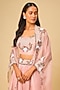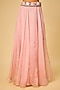 Featuring a flamingo pink blouse in silk base with thread work. It is paired with an organza cape and a skirt. Accentuate it with minimal jewellery and heels for a festive look.