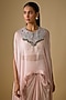 Featuring a flamingo pink A-line kaftan in organza base with thread work. It is paired with a cotton lycra bustier and a modal satin skirt. Accentuate it with diamond earrings and heels for festive occasions or sangeet ceremony.