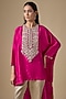 Featuring a fuchsia pink kaftan in silk base with resham work. It is paired with cotton satin pants. Style this set with dangler earrings and heels for a festive occasion, family gathering or intimate pooja ceremony.