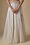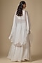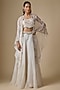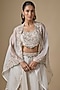 Featuring an ivory cape in organza base. It is paired with a skirt and silk blouse having moti and resham work. Style this set with diamond dangler earrings and heels for a reception, wedding, sangeet or engagement ceremony.