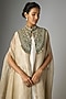 Featuring a champagne jacket in crushed tissue base with dori work. It is paired with an ivory silk dress. Accentuate it with statement jewellery and heels for an evening look.