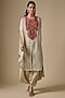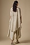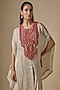 Featuring an ivory kaftan in tissue base with thread work. It is paired with a cotton lycra bustier and cotton satin pants. Style this set with dangler earrings and heels for a festive occasion, cultural event, sangeet or engagement ceremony.