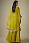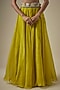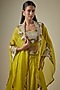 Featuring a lime green cape in organza base with thread work. It is paired with a silk blouse and a skirt. Accentuate it with statement jewellery and heels for a sangeet ceremony or festive occasion.