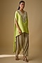 Featuring a lime green kaftan in silk base with moti and resham work. It is paired with beige cotton satin pants. Accentuate it with dangler earrings and heels for festive occasions.