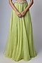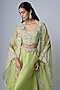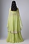Featuring a lime cape in organza base with resham and moti work. It is paired with a silk blouse and a skirt. Accentuate it with statement earrings, a clutch and block heels for weddings or engagement ceremonies.