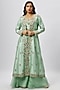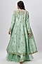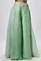 Featuring a mint jacket in silk base with dori embroidery. It is paired with a blouse and organza sharara pants. Accentuate it with statement jewellery and heels for a festive occasion or sangeet ceremony.