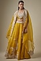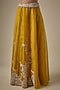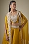 Featuring a mustard cape in organza base with resham and maal work. It is paired with a silk blouse and a kalidar skirt. Accentuate it with statement jewellery and heels for a haldi ceremony or festive occasion.