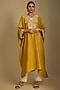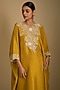 Featuring a mustard kaftan in silk base with 3D floral work. It is paired with ivory cotton satin pants. Accentuate it with statement jewellery and heels for a festive occasion or wedding ceremony