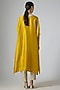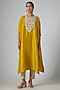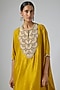 Featuring a mustard kaftan in silk base with moti and resham embroidery. It is paired with smoke cotton satin pants. Accentuate it with kundan polki jewellery and block heels for festive occasion, pooja or family gatherings.