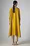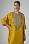 Featuring a mustard kaftan in silk base with thread embroidery. It is paired with cotton satin pants. Accentuate it with kundan polki jewellery and block heels for festive occasion, pooja or family gatherings.