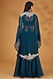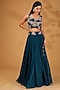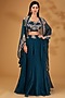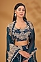 Featuring a navy blue blouse in silk base with dori work. It is paired with an organza cape and a skirt. Perfect for a festive occasion or wedding ceremonies, showcasing style and sophistication.