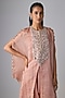 Featuring a peach kaftan in tissue base with resham work. It is paired with a cotton lycra bustier and cotton satin pants. Accentuate it with dangler earrings and heels for festive wear or wedding ceremonies.