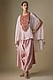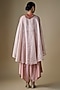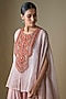 Featuring a peach kaftan in tissue base with thread work. It is paired with a cotton lycra bustier and cotton satin pants. Accentuate it with zircon earrings and juttis for festive celebrations, daytime functions or sangeet ceremony.