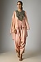 Featuring a peach umbrella kaftan in tissue base with thread work. It is paired with a cotton lycra bustier and cotton satin pants. Accentuate it with statement earrings and heels for festive occasions.