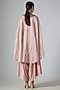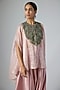Featuring a pink kaftan in tissue base with thread embroidery. It is paired with a cotton lycra bustier and cotton satin pants. Accentuate it with kundan polki jewellery and block heels for festive occasion, pooja or family gatherings.