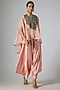 Featuring a pink umbrella kaftan in tissue base with thread embroidery. It is paired with a cotton lycra bustier and cotton satin pants. Accentuate it with kundan polki jewellery and block heels for festive occasion, pooja or family gatherings.