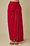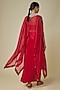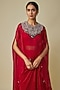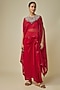 Featuring a red kaftan in organza base with maal and dori work. It is paired with a cotton lycra bustier and a crepe skirt. Accentuate it with statement jewellery and heels for a festive occasion or cocktail ceremony.