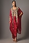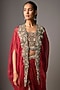 Featuring a red cape in silk and organza base with embroidery. It is paired with a blouse and a skirt. Style this set with dangler earrings and heels for a festive occasion, cocktail or sangeet ceremony.