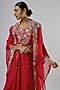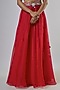 Featuring a red skirt in organza base with dori work. It is paired with a silk blouse and a cape. Accentuate it with statement jewellery and heels for a sangeet or engagement ceremony.