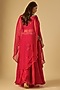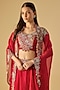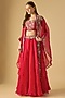Featuring a red blouse in silk base with maal work. It is paired with an organza cape and a skirt. Accentuate it with minimal jewellery and heels for a festive look.