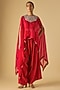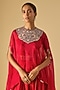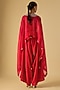 Featuring a red A-line kaftan in organza base with resham and maal work. It is paired with a cotton lycra bustier and cotton satin pants. Accentuate it with minimal jewellery and heels for a festive look.