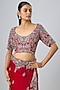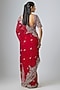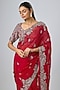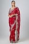 Featuring a red saree in organza base with zari work. It is paired with a silk blouse having maal work. Accentuate it with statement earrings and heels for weddings or sangeet ceremonies.