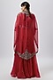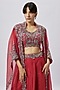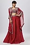Featuring a red cape in organza base with maal and zari work. It is paired with a silk blouse and a skirt. Accentuate it with statement earrings and heels for a sangeet or engagement ceremony.