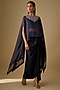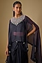 Featuring a royal blue A-line kaftan in organza base with thread work. It is paired with a cotton lycra bustier and a modal satin skirt. Accentuate it with diamond earrings and heels for festive occasions or sangeet ceremony.