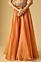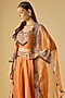 Featuring a rust blouse in silk base with maal work. It is paired with an organza cape and a skirt. Accentuate it with dangler earrings and heels for festive occasions or wedding ceremonies.