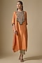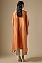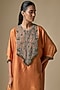 Featuring a rust kaftan in silk base with threadwork. It is paired with cotton satin pants. Style this set with dangler earrings and heels for a festive occasion, family gathering, cultural events or intimate pooja ceremony.