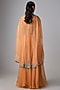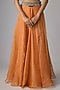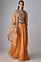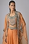 Featuring a rust blouse in silk base with thread work. It is paired with an organza cape and a skirt. Accentuate it with stud earrings and heels for festive wear, sangeet or wedding ceremonies.
