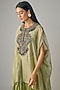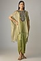 Featuring a sea green kaftan in crushed tissue base with dori and thread work. It is paired with a cotton lycra bustier and a modal satin dhoti. Accentuate it with stud earrings and heels for festive wear, mehendi or wedding ceremonies.