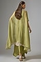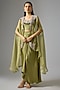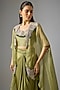 Featuring a sea green cape in organza base with dori and maal work. It is paired with a modal satin skirt and a silk blouse having dori and maal work. Accentuate it with statement earrings and heels for weddings or mehendi ceremonies.