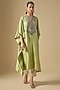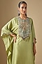 Featuring a sea green kaftan in silk and organza base with thread work. It is paired with cotton satin pants. Accentuate it with polki earrings and block heels for a festive occasion, sangeet or mehendi ceremony.