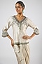 Featuring a smoke grey peplum top in chanderi base with thread embroidery. It is paired with a modal satin dhoti skirt. Accentuate with kundan stud earrings, a potli bag and heels for a festive occasion, mehendi or sangeet ceremonies.