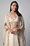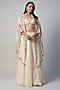 Featuring an ivory cape in organza base with resham and zari embroidery. It is paired with a silk blouse and a skirt. Accentuate with statement earrings and heels for a sangeet or engagement ceremony.
