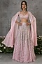 Featuring a baby pink and silver lehenga in georgette base with sequins, salli, and pearl embroidery. It is paired with a matching cape style blouse.