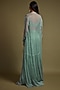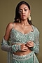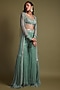 Featuring a teal jacket in chiffon bas with thread, sequins and cutdana embroidery. It is paired with a blouse and sharara pants. Elevate your look with statement jewellery and chic heels for a wedding, sangeet or engagement ceremony.