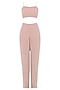Featuring a pastel peach side vent jacket in georgette base with self color thread and off white beads embroidery. It is paired with matching inner spaghetti top and slim fit pants.