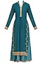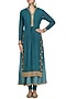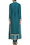 This set features a sky blue double layered kurta in cotton base with ikat printed underlayer and gold gota lace detailing on the neckline.