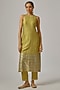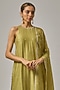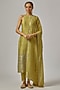 Featuring a pistachio green kurta in chanderi base with a halter neckline, geometric motifs and hand embroidery. It is paired with cotton pants and a viscose organza embroidered dupatta. Accentuate it with dangler earrings and heels for a festive occasion, intimate pooja ceremony or family gathering.