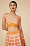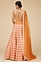 Featuring a pumpkin orange lehenga in raw silk base with sequin and zari aari work. It is paired with a blouse and a silk organza dupatta. Accentuate this designer lehenga with gold jewellery and heels for a wedding or an engagement ceremony.
