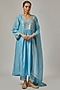 Featuring a sky blue kurta in chanderi base with geometric motifs and hand embroidery. It is paired with cotton pants and a viscose organza embroidered dupatta. Accentuate it with dangler earrings and heels for a festive occasion, intimate pooja ceremony or family gathering.