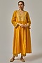 Featuring a turmeric yellow kurta in chanderi base with geometric motifs and hand embroidery. It is paired with cotton pants and a viscose organza embroidered dupatta. Accentuate it with dangler earrings and heels for a festive occasion, haldi, intimate pooja ceremony or family gathering.