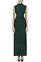 Featuring a bottle green formal sleeveless gown in metallic lycra knit with a band collar in stretch lightweight knit and self color closely paced metallic stripes.
