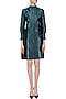 Featuring a peacock blue coat dress in lightweight stretch metallic imported woven fabric with chinese collar and enclosed button stand for the front opening. The sleeves are fuller with cuff detail and back is gathered below the waist giving a fuller look.