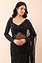 Featuring a black draped saree in georgette base with sequins and beads embroidery, including tassels detailing. It is paired with an embellished blouse and a sheer net pallu. Accentuate it with statement cuff bracelets, sleek heels, and a low bun for a striking ensemble, ideal for cocktail parties, evening soirees or glamorous receptions.